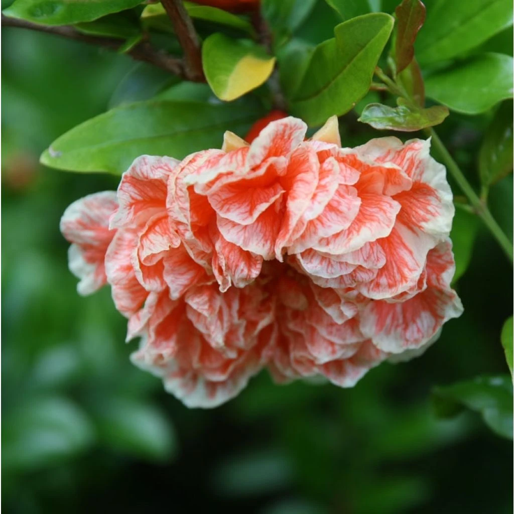 Le Punica granatum Legrelliae ou California Sunset est un grenadier à fleurs d’origine incertaine, apprécié non pas pour ses fruits, qui ne se forment jamais, mais pour sa magnifique floraison double. Ses grandes fleurs d’aspect chiffonné sont chargées de pétales panachés d’orange, de saumon et de crème, et éclosent en abondance en fin de printemps ou en été selon le climat. Cet arbuste vigoureux ne porte pas d’épines, et son feuillage caduc, d’un vert brillant, prend une belle teinte jaune d’or en automne. Cet arbuste à la floraison généreuse est peu exigeant sur la nature du sol, préfère les terres fraîches en profondeur, mais résiste très bien la sécheresse.